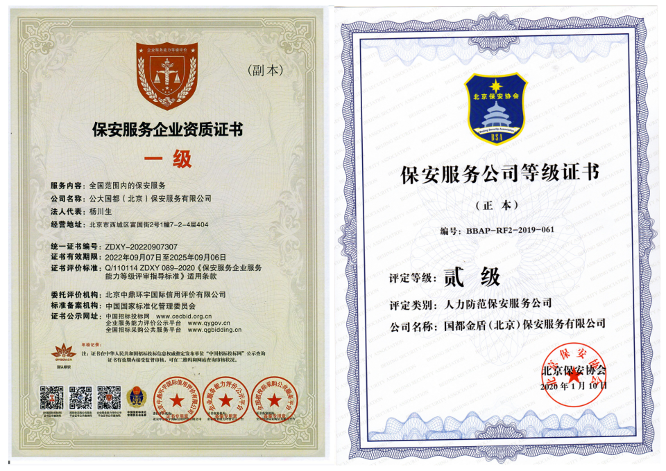 公大国都公司成立于 1995 年;原前身为中国人民公安大学高级保安培训中心,2007 年移交给北京市保安服务总公司,成立国都公司,公司 2010 年改制后,从国有企业转为民营企业。公大国都保安服务有限公司,是国务院颁布实施保安服务管理条例以后。第一批过获得北京市公安局行政许可,被评为北京市保安服务公司第三名《北京公安局京公文号 003》是一家规模较大的大型保安公司,现有保安、安检人员 8000 多人。公司高层管理者均来自,武警复转团级以上干部和离退公安高级警官。通过十几年的不懈追求努力,在社会上树立了健康向上的企业形象。中央电视台、人民日报、法制晚报。保安专业服务“金牌服务商”国庆 60 周年安保勤务先进单位,同年获得∕1SO9001∕国防质量体系认证。公司自成立初始就牢固树立采用国际通行的保安服务标准,为客户提供全方位的保安服务并使客户满意的服务理念,本着“站在客户的角度一切为客户着想”的原则,坚持走规范、创新、发展的路子,始终以“客户满意为追求”致力于为客户提供安防服务。公大国都保安公司还在全国同多家世界知名保安机构建立了长期战略合作伙伴关系,拥有一支由国内外资深安保专家组成的顾问团队,我们的客户主要包括政府机构、金融押运、航空安全、地铁安检、外资企业、大厦等。公司致力于为客户提供,卓越的服务,力争全国领先的安全服务。